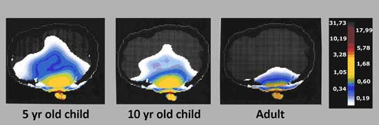 Manufacturers report that cell and wireless phones emit electromagnetic radiation. Electromagnetic fields are likely to penetrate the brain of children more deeply than adults. Modeling in the diagram below estimate that young children are more susceptible to electromagnetic fields due to smaller sized brains and softer brain tissue.