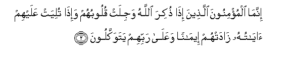 True believers are those whose hearts tremble with awe when God is mentioned, whose faith increases when His Revelations are recited to them, who put their trust in their Lord,